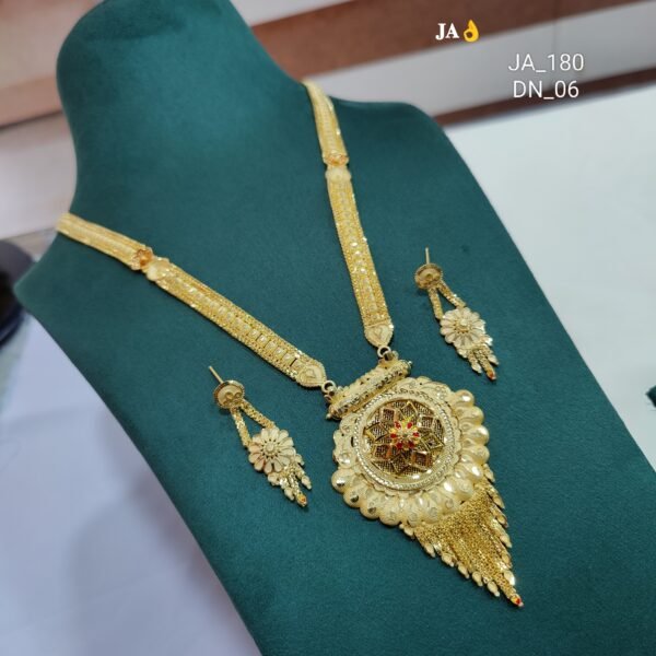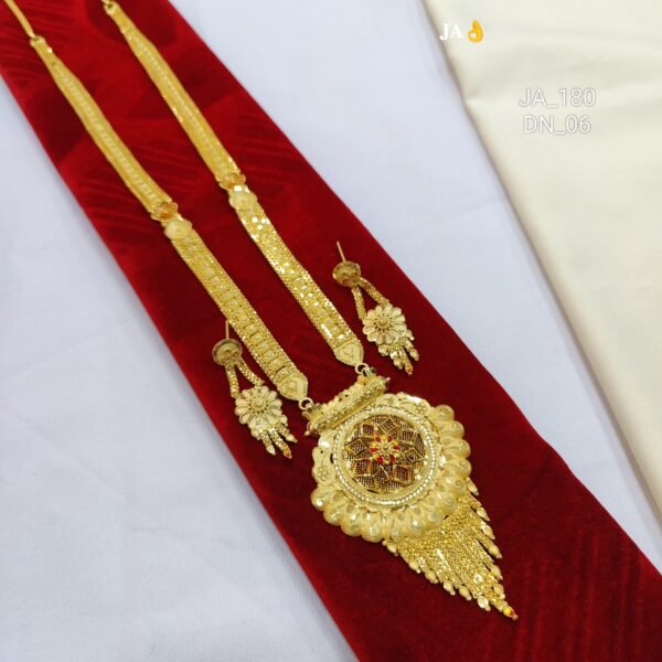 Add a royal touch to your traditional attire with this exquisitely designed Rani Har in gold polish. Inspired by the grandeur of royal heritage, this long necklace features intricate patterns and fine craftsmanship that radiate grace and sophistication. Crafted using premium-quality alloy and finished with a rich gold polish, it gives you the luxurious look of real gold without the heavy cost. Ideal for bridal wear, festive occasions, and traditional ceremonies, this Rani Har enhances every outfit with elegance and majesty. Lightweight yet regal in appearance, it ensures comfort with every wear while leaving a lasting impression.