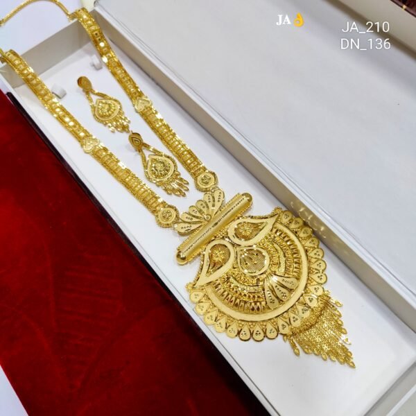 Add a royal touch to your traditional attire with this exquisitely designed Rani Har in gold polish. Inspired by the grandeur of royal heritage, this long necklace features intricate patterns and fine craftsmanship that radiate grace and sophistication. Crafted using premium-quality alloy and finished with a rich gold polish, it gives you the luxurious look of real gold without the heavy cost. Ideal for bridal wear, festive occasions, and traditional ceremonies, this Rani Har enhances every outfit with elegance and majesty. Lightweight yet regal in appearance, it ensures comfort with every wear while leaving a lasting impression.