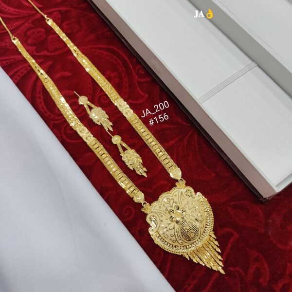Add a royal touch to your traditional attire with this exquisitely designed Rani Har in gold polish. Inspired by the grandeur of royal heritage, this long necklace features intricate patterns and fine craftsmanship that radiate grace and sophistication. Crafted using premium-quality alloy and finished with a rich gold polish, it gives you the luxurious look of real gold without the heavy cost. Ideal for bridal wear, festive occasions, and traditional ceremonies, this Rani Har enhances every outfit with elegance and majesty. Lightweight yet regal in appearance, it ensures comfort with every wear while leaving a lasting impression.