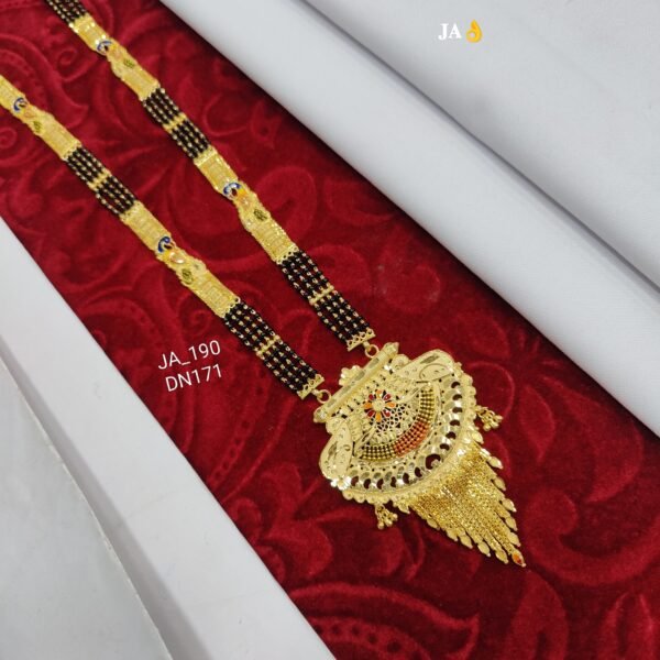 Enhance your traditional look with this elegant 32-inch Mangalsutra, perfect for weddings, festivals, and special occasions. This beautifully crafted piece comes with a one gram gold-plated finish that gives it a rich and graceful appeal.