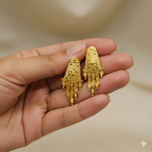Whether paired with a saree, lehenga, or a chic Indo-western outfit, these earrings bring just the right amount of sparkle without being overpowering. Their compact size ensures all-day comfort, while the rich golden sheen adds a luxurious charm to your look.