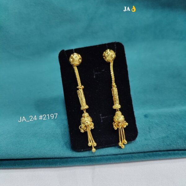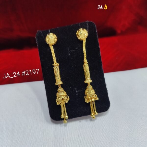 Add a touch of traditional charm to your everyday look with these elegant gold-toned earrings. Designed in a classic jhumka-inspired style, these earrings feature delicate floral detailing on the stud and intricate hanging elements that offer graceful movement.