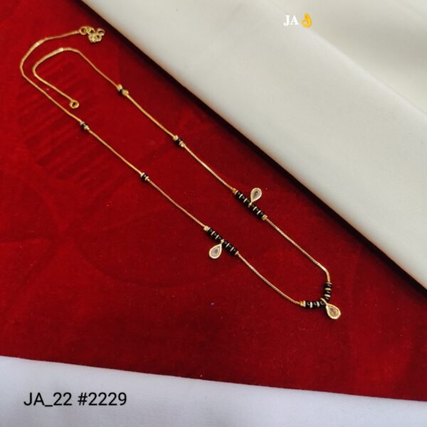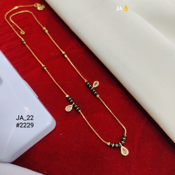 A graceful blend of tradition and modern elegance, this royal designer mangalsutra features delicate black beads, a premium gold finish chain, and sparkling teardrop CZ pendants. Lightweight, stylish, and perfect for everyday wear or special occasions.