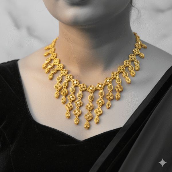 A stunning traditional design in rich gold finish, featuring intricate filigree work and matching earrings — perfect for weddings and festive wear. ✨