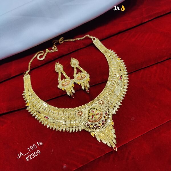 The necklace features a bold, elegant design that enhances bridal outfits as well as traditional attire such as sarees, lehengas, and anarkalis. Paired with perfectly matching earrings, this set offers a complete and luxurious look.