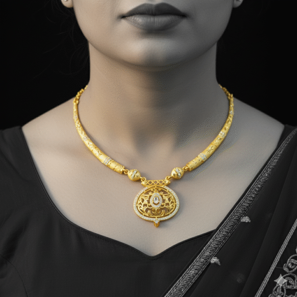 This exquisite piece features a unique intertwined loop design, finely embellished with sparkling AD stones and finished in radiant gold polish. The intricate detailing reflects expert craftsmanship, creating a look that’s elegant, versatile, and effortlessly glamorous.