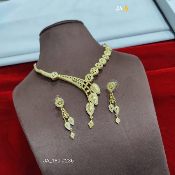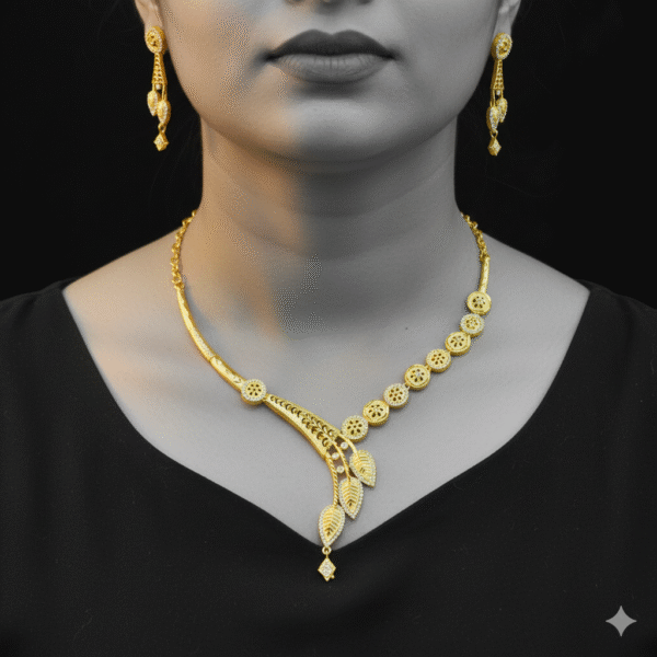 A stunning traditional design in rich gold finish, featuring intricate filigree work and matching earrings — perfect for weddings and festive wear. ✨