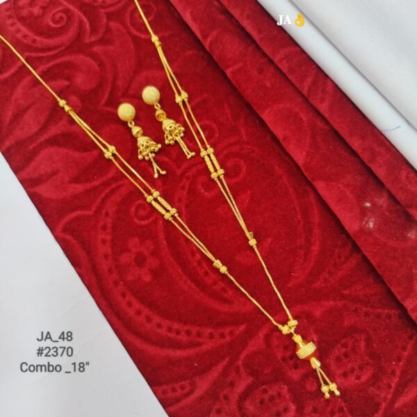 The combo is completed with matching designer jhumki-style earrings, showcasing intricate craftsmanship and a timeless ethnic charm. Lightweight yet luxurious, this set is ideal for married women who love subtle sophistication in their everyday jewelry, while also making a statement at festive events, weddings, or cultural celebrations.