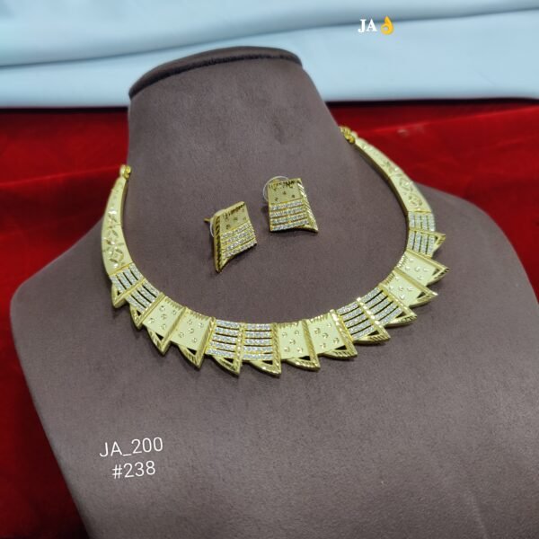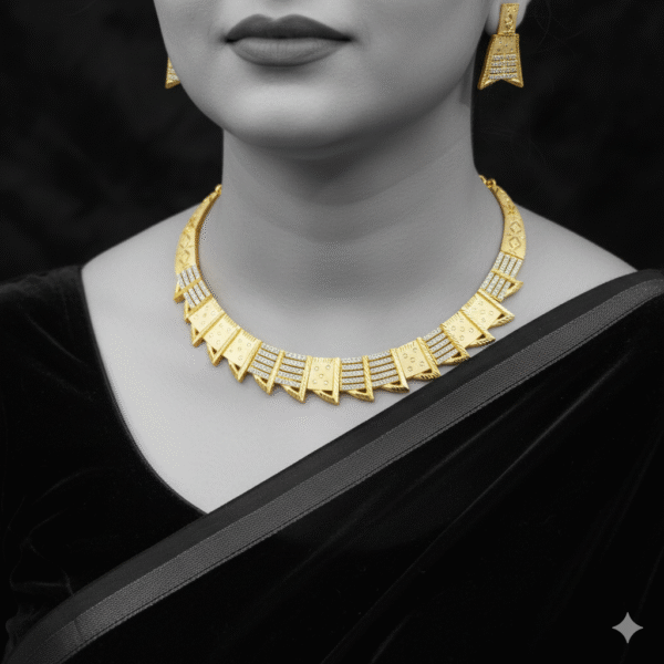 A stunning traditional design in rich gold finish, featuring intricate filigree work and matching earrings — perfect for weddings and festive wear. ✨