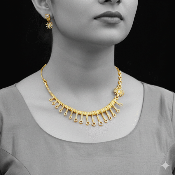 A stunning traditional design in rich gold finish, featuring intricate filigree work and matching earrings — perfect for weddings and festive wear. ✨