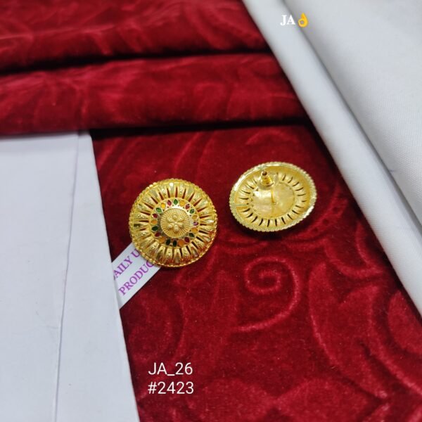 Elevate your jewelry collection with these royal gold-plated traditional stud earrings, designed to reflect classic Indian craftsmanship with a modern touch. The elegant circular pattern showcases fine detailing, beautifully enhanced with multicolor stone accents that add a rich and festive charm.