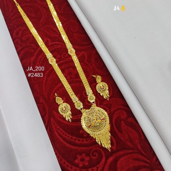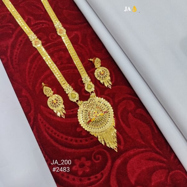 Elevate your ethnic elegance with this stunning traditional gold plated necklace set, designed for women who love timeless beauty with a royal touch. The long, finely detailed chain showcases artistic craftsmanship, leading to a magnificent statement pendant adorned with intricate patterns and delicate hanging elements that enhance its luxurious appeal.