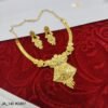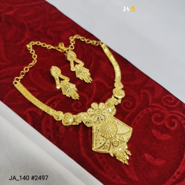 A stunning traditional gold necklace set featuring an intricately handcrafted pendant and perfectly matching earrings. Designed to add royal elegance and timeless charm to weddings, festive occasions, and grand celebrations.
