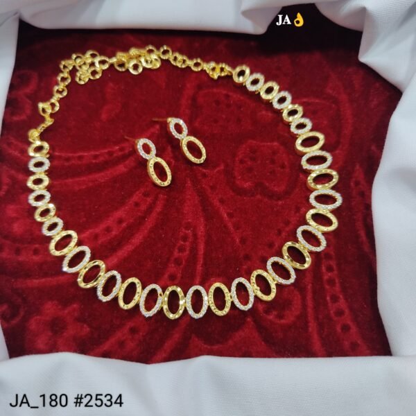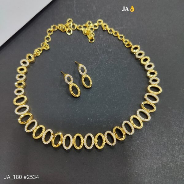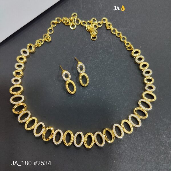A luxurious oval-design necklace set with a premium gold finish and sparkling stones, paired with elegant matching earrings. Perfect for weddings, parties, and special occasions.