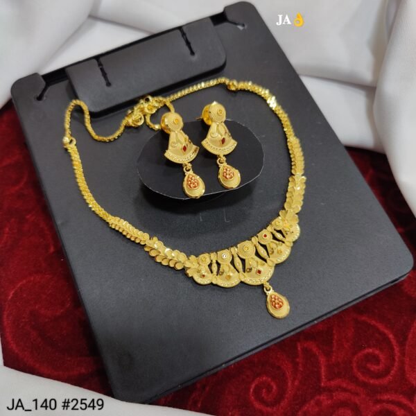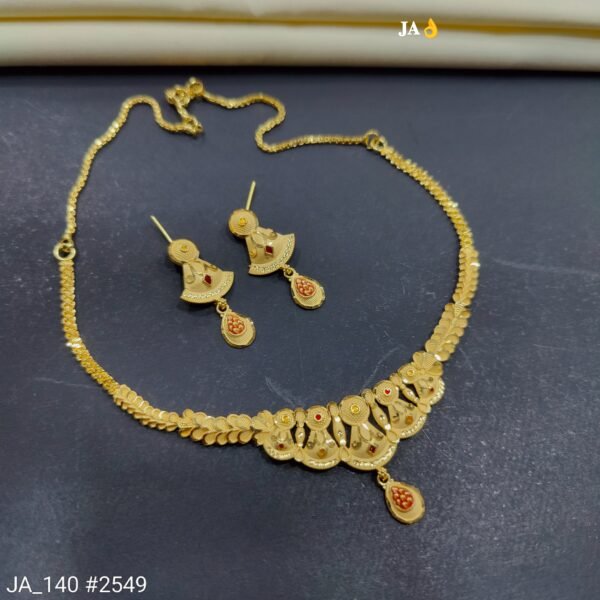 Embrace timeless elegance with this Royal Antique Gold Necklace Set, designed to reflect classic heritage and refined beauty. The necklace showcases exquisite craftsmanship with finely detailed patterns, a rich antique gold finish, and subtle red stone highlights that enhance its regal appeal. The central hanging motif adds grace and sophistication to the overall design.