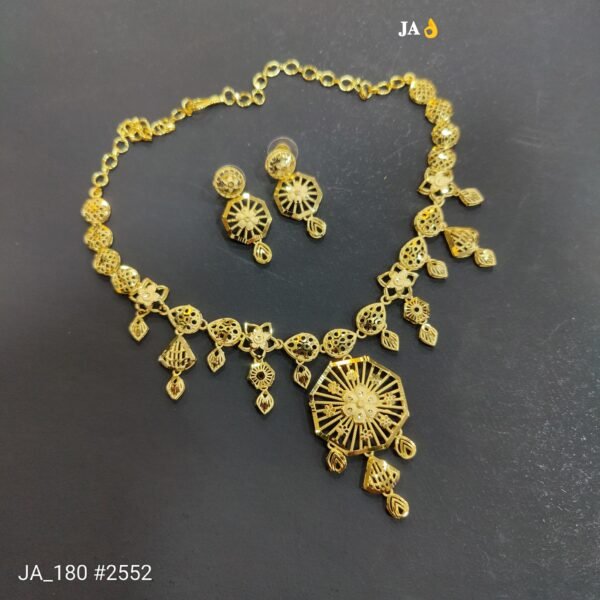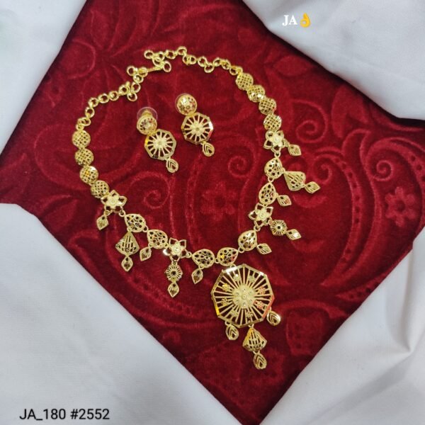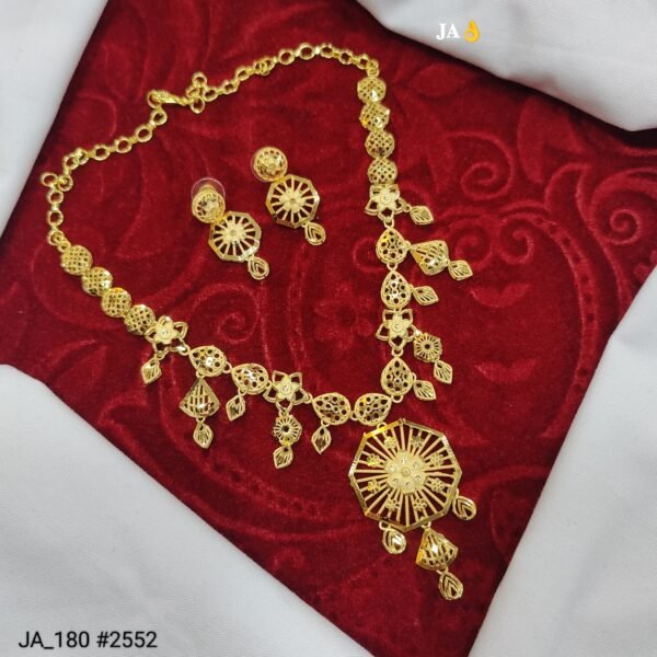 The matching earrings complement the necklace perfectly with a coordinated filigree pattern and graceful drop detailing, offering a balanced and refined appearance. Lightweight yet luxurious, this jewelry set is comfortable to wear for long hours during weddings, festivals, and special celebrations.