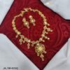 Celebrate timeless beauty with this royal gold-plated traditional necklace set, crafted to reflect classic Indian artistry. The necklace is adorned with finely detailed filigree elements, floral accents, and delicate dangling drops that create a rich and sophisticated look. The beautifully designed central pendant adds a bold focal point, enhancing the overall elegance of the set.