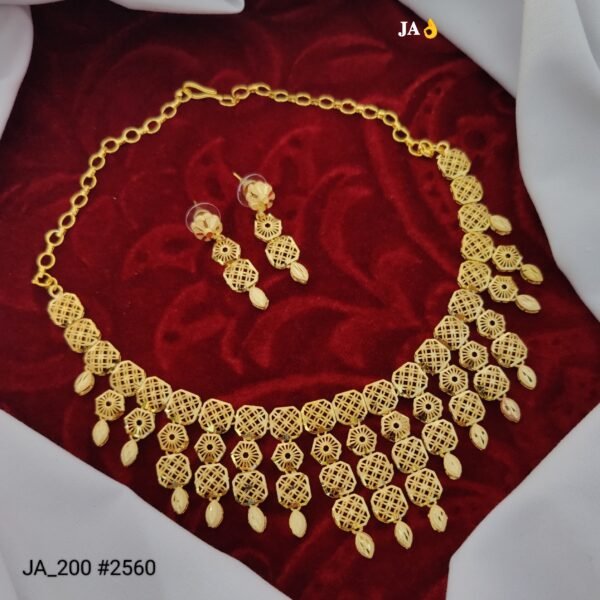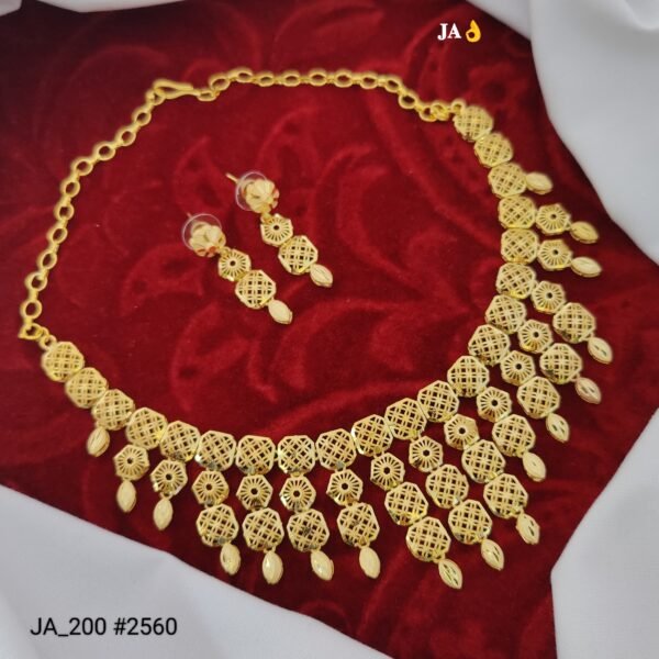 The beautifully structured necklace is complemented by matching earrings, creating a harmonious and graceful look. Despite its detailed design, the set is lightweight and comfortable, making it ideal for long hours of wear.