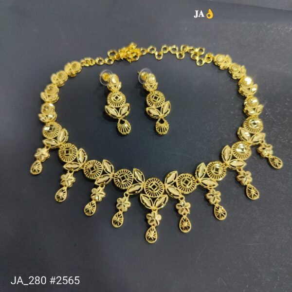 Make a statement with our exquisitely crafted Floral Lattice Necklace Set. This masterpiece is designed for the woman who appreciates the fine details of traditional artistry combined with contemporary comfort. Every link and motif is polished to perfection to provide a rich, authentic gold luster.