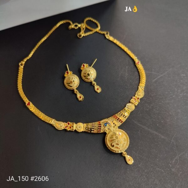 This exquisite traditional gold-tone necklace set reflects the true essence of timeless Indian craftsmanship. Designed with a beautifully detailed circular pendant, intricate cut-work patterns, and subtle stone accents, this set delivers a rich and regal appearance.