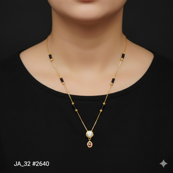 A graceful gold-plated mangalsutra featuring traditional black beads and a sparkling crystal pendant with a delicate red stone drop, perfect for everyday elegance.
