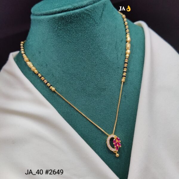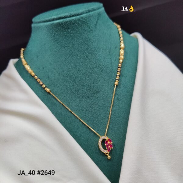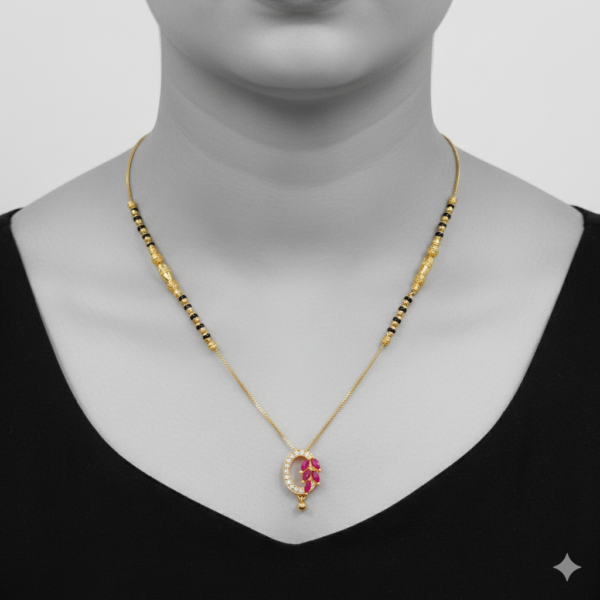 This beautifully designed mangalsutra blends traditional symbolism with graceful modern artistry. The highlight of the piece is a crescent-shaped pendant, adorned with delicate floral elements and ruby-tone stones, enhanced with shimmering accents that add a refined sparkle.