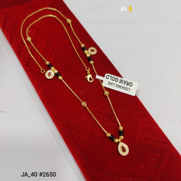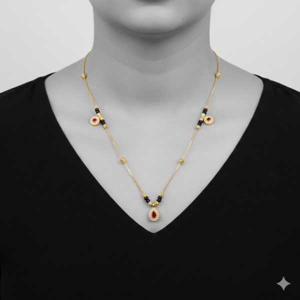 This beautifully crafted mangalsutra combines classic Indian tradition with refined contemporary elegance. The centerpiece is a teardrop-shaped ruby-tone pendant, surrounded by shimmering stones that add brilliance and depth, creating a sophisticated yet timeless look.