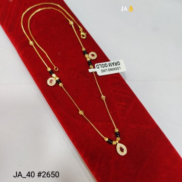 Adding a unique touch, the design includes dual round charm accents along the chain, enhancing the overall balance and elegance of the piece. Crafted with traditional black beads and a high-quality gold-finish chain, this mangalsutra offers durability, comfort, and long-lasting shine.