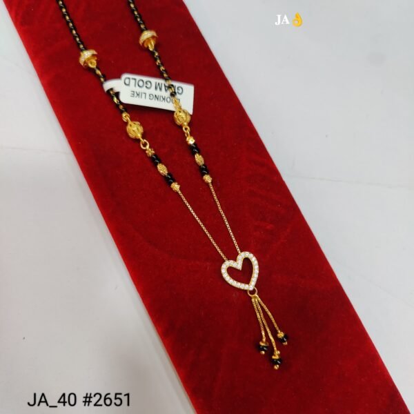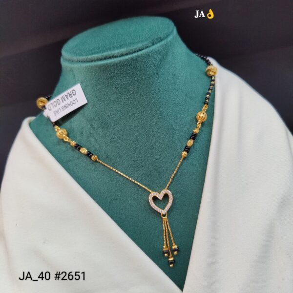 Crafted with classic black beads and a high-quality gold-finish chain, this mangalsutra offers durability along with a refined shine. Its lightweight design ensures all-day comfort, making it ideal for daily wear, while the eye-catching heart pendant makes it perfect for festive occasions, weddings, and romantic celebrations.