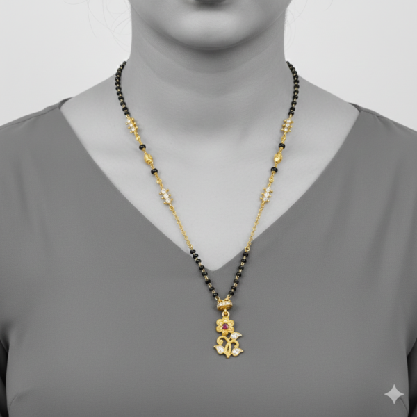This graceful mangalsutra showcases a traditional floral drop pendant, designed with fine detailing and highlighted by a radiant center stone that adds a subtle pop of color and brilliance. The leaf-inspired stone accents enhance the pendant’s beauty, giving it a refined and feminine appeal.