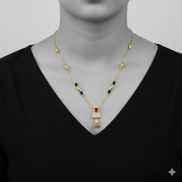 This classic yet stylish mangalsutra is crafted to highlight elegance in simplicity. The design features a square ruby-tone center stone set within a clean geometric frame, enhanced with fine crystal detailing that reflects light beautifully. The subtle hanging drop adds a graceful touch without overpowering the look.