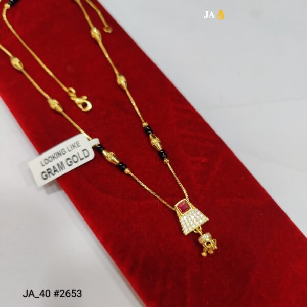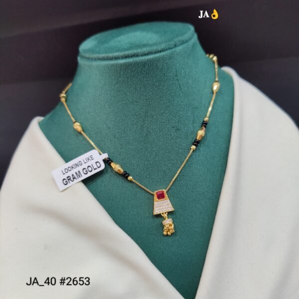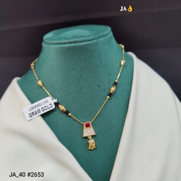 Paired with traditional black beads and a high-quality gold-finish chain, this mangalsutra offers a perfect balance of durability and shine. Lightweight and comfortable, it is ideal for everyday wear, while the refined pendant design makes it suitable for festive events, office wear, and special occasions.