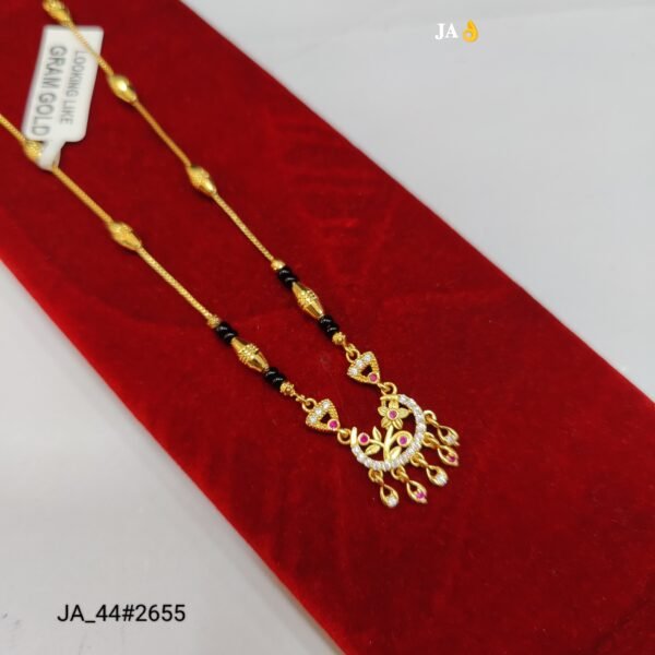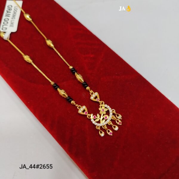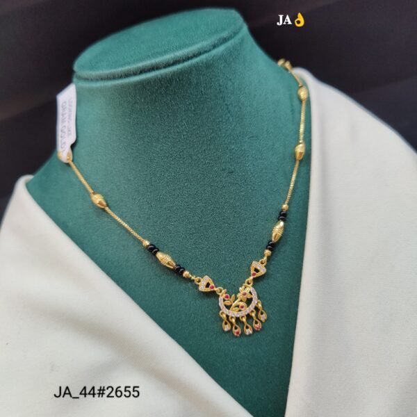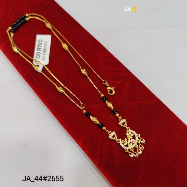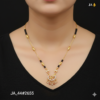 Celebrate the beauty of tradition with a touch of contemporary sparkle through this stunning Designer Mangalsutra (JA_44#2655). Thoughtfully crafted with a delicate gold-finish chain and traditional black beads, this piece symbolizes love and elegance in the most graceful way.