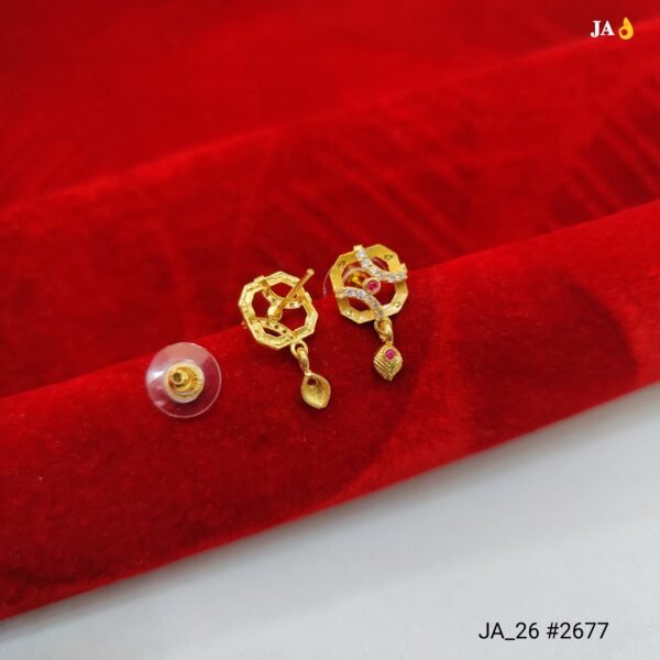 The top features a unique octagonal frame with an artistic swirl pattern adorned with shimmering white stones. At the center, a vibrant pink stone adds a rich royal touch, making the design stand out effortlessly. The delicate drop element at the bottom, highlighted with a pink stone accent, enhances the overall grace and movement of the earrings.