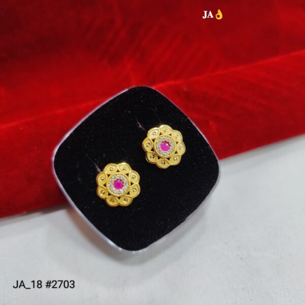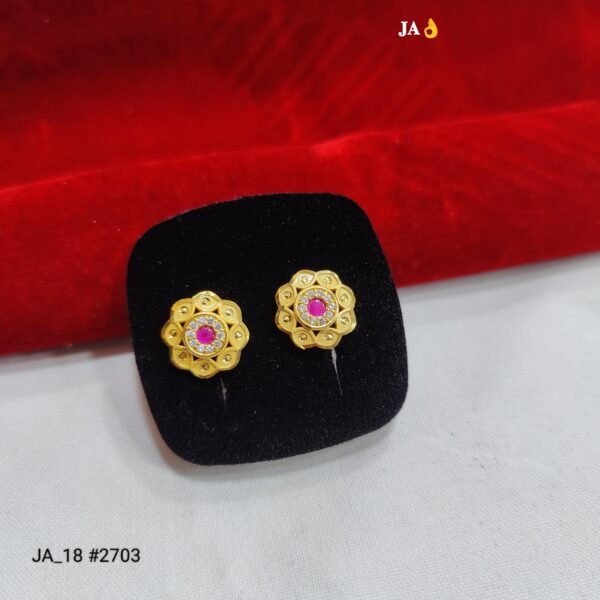 Add a touch of royalty to your jewellery collection with these stunning Royal Pink Bloom Gold Stud Earrings. Designed in a beautiful floral pattern, these earrings feature a radiant pink stone at the center, encircled by shimmering white stones that enhance their brilliance.