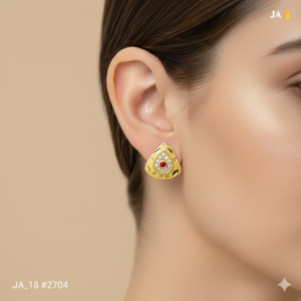 Introducing the exquisite Scarlet Aura Gold Stud Earrings — a perfect harmony of sophistication and brilliance. Designed in a refined triangular-teardrop silhouette, these studs feature a captivating scarlet-red center stone that instantly draws attention.