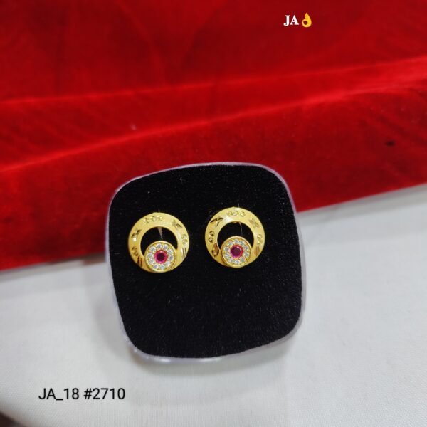These earrings showcase a sleek circular (orbit-inspired) design with a beautifully set ruby-pink stone at the center, encircled by shimmering white crystals that create a radiant halo effect. The outer gold frame is enhanced with subtle engraved detailing, giving the studs a refined and premium finish.