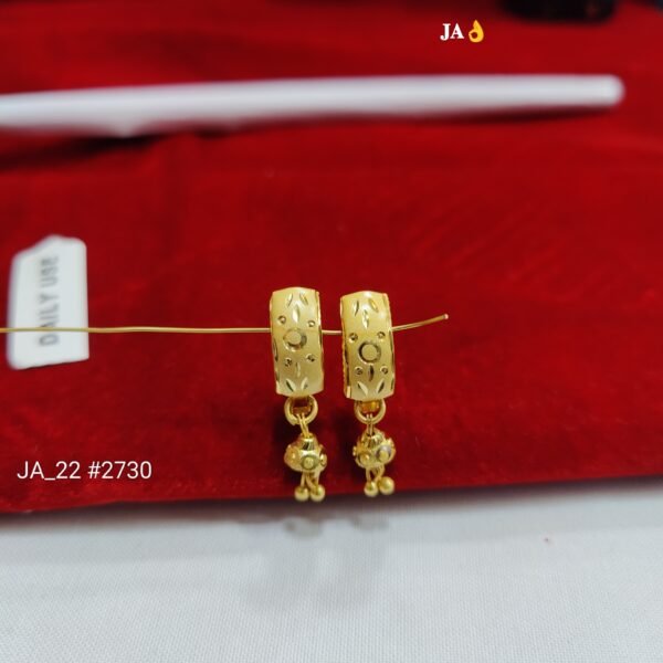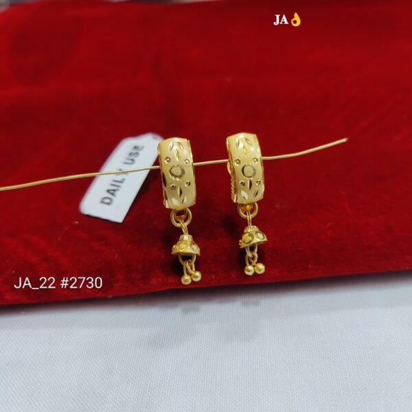 The finely carved hoop is adorned with subtle textured patterns that enhance its rich appearance. The charming mini jhumki drop with twin golden bead danglers adds soft movement and elegance, making every look more radiant and graceful.