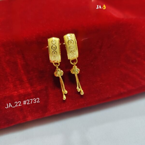 Enhance your style with these beautifully crafted Royal Chain Drop Gold Hoops, designed to reflect timeless sophistication. The finely engraved circular pattern on the hoop adds depth and a rich golden shine, giving the earrings a classy and premium appeal.