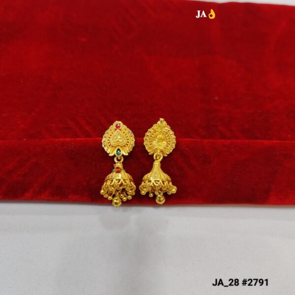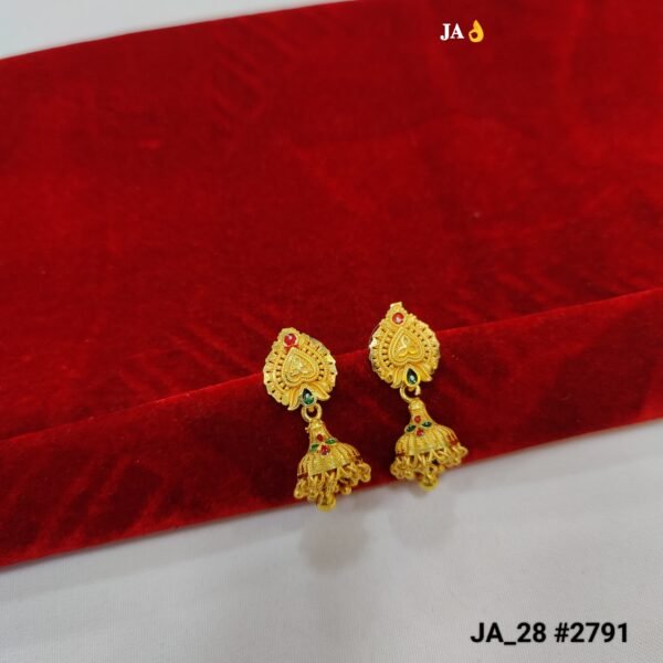 Add a touch of royal elegance to your look with these beautifully crafted Gold Plated Traditional Jhumka Earrings. Designed with intricate temple-style patterns, these earrings feature a stunning top motif with delicate detailing and small red and green stone accents that enhance their traditional charm.