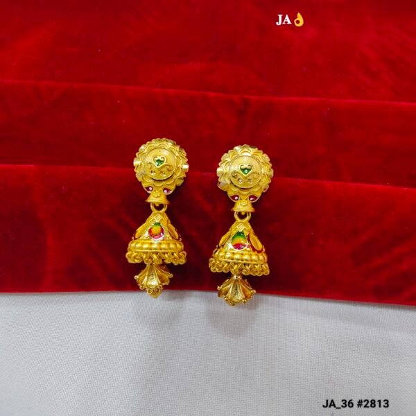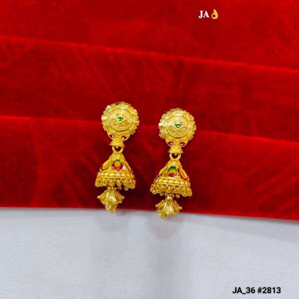 Redefine grace with our Lotus-Bud Heritage Jhumkas. The standout feature is the sculpted floral bud hanging from the center of the dome, symbolizing purity and elegance. Adorned with emerald-green and ruby-red accents, these earrings offer a designer boutique look that is versatile enough for both festive events and formal family gatherings.