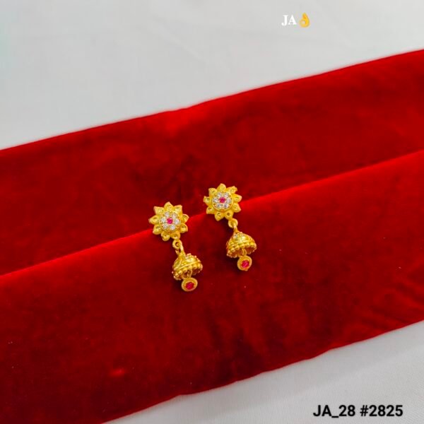 Elevate your ethnic wardrobe with these meticulously crafted Sunflower Drop Jhumkas. The design features a central Sun-inspired stud adorned with a vibrant ruby-colored stone, surrounded by high-quality white crystals that capture light beautifully from every angle.