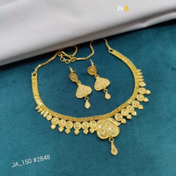 The necklace features finely textured gold work adorned with delicate coin motifs that symbolize prosperity and tradition. The centerpiece highlights a beautifully engraved heart-shaped pendant with detailed patterns and a graceful drop element, adding a touch of grandeur and femininity.