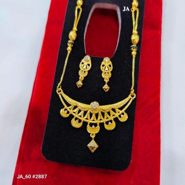 Enhance your traditional look with this stunning gold plated mangalsutra set designed with fine craftsmanship and elegant detailing. The necklace features a beautifully patterned pendant with delicate design elements and sparkling stone highlights that add a royal charm. The classic black beads combined with the stylish gold chain create a perfect blend of tradition and modern fashion.