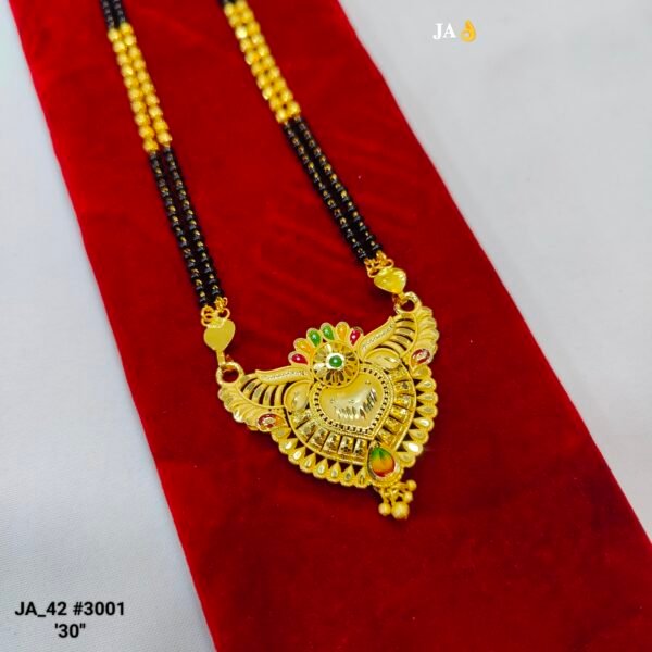 This Premium Gold-Plated Long Mangalsutra is a masterpiece of design, perfectly blending traditional artistry with a touch of modern elegance. The intricate detailing on the pendant and the layered chain make it a must-have for your jewelry box.