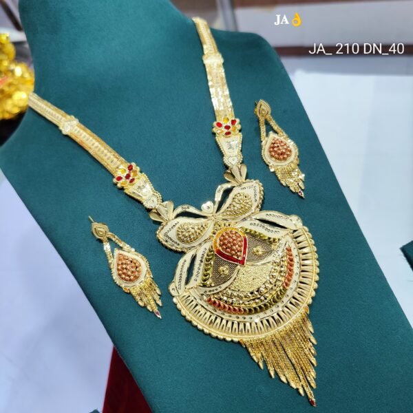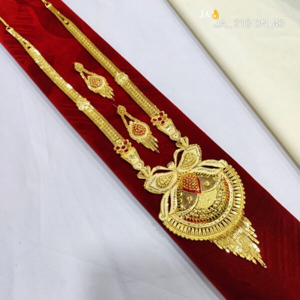 Add a royal touch to your traditional attire with this exquisitely designed Rani Har in gold polish. Inspired by the grandeur of royal heritage, this long necklace features intricate patterns and fine craftsmanship that radiate grace and sophistication. Crafted using premium-quality alloy and finished with a rich gold polish, it gives you the luxurious look of real gold without the heavy cost. Ideal for bridal wear, festive occasions, and traditional ceremonies, this Rani Har enhances every outfit with elegance and majesty. Lightweight yet regal in appearance, it ensures comfort with every wear while leaving a lasting impression.