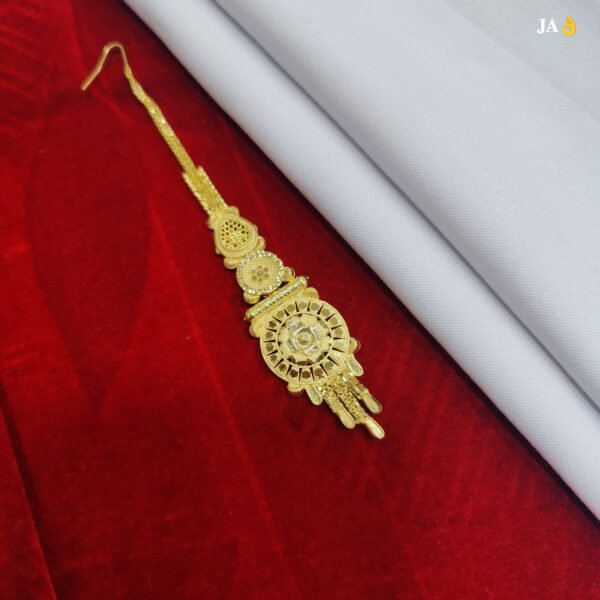 The Imperial Grace Gold Mang Tikka is a masterpiece of traditional artistry, created for brides who appreciate elegance, heritage, and sophistication. Featuring a beautifully sculpted round motif with intricate engravings and graceful hanging accents, this mang tikka delivers a rich and majestic appearance.