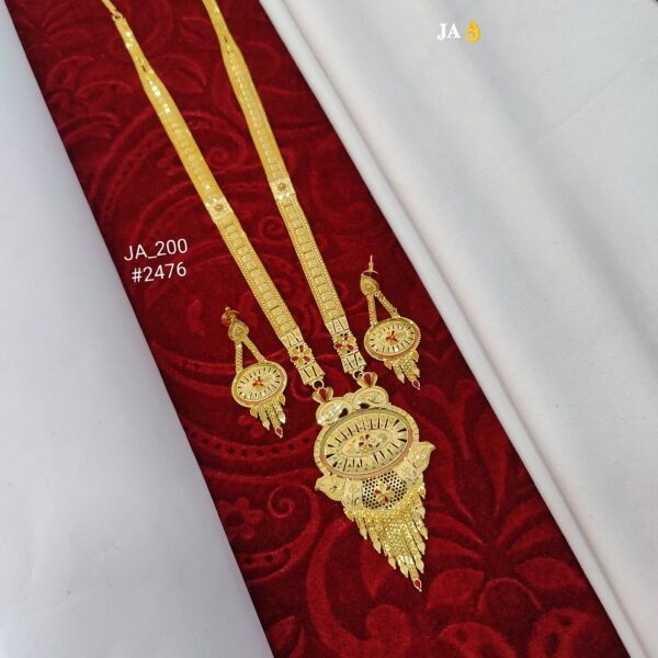 The long necklace chain is crafted with a premium gold finish, offering durability, comfort, and a sophisticated shine. Paired with matching designer earrings, this set delivers a complete and harmonious traditional look.